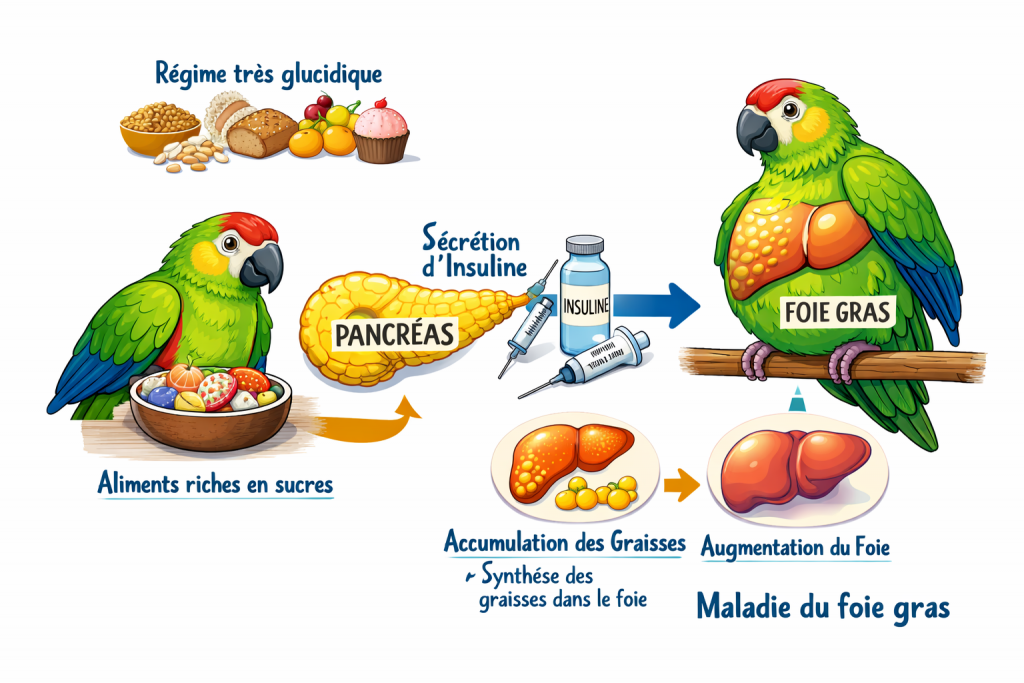 Premièrement, comment le foie du perroquet stocke t-il les graisses au point de devenir « énorme et malade » (ce qu’on appelle une stéatose hépatique non alcoolique) ?