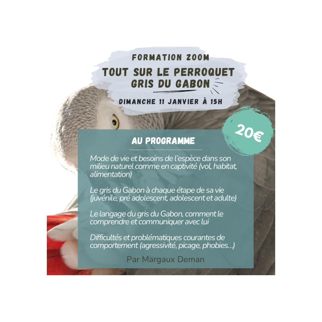 20.00€ Vidéo à voir et revoir sans modération ! Si vous éprouvez des difficultés à télécharger le fichier de cette commande, n’hésitez pas à me contacter directement par mail : consultation.perroquet@gmail.com ou Whatsapp : 0642448216 quantité de Formation Zoom en replay - Tout sur le perroquet gris du Gabon Ajouter au panier Catégorie : Replay des formations Description Description Découvrez le perroquet gris du Gabon comme vous n’en avez jamais entendu parler ! Produits similaires Replay des formationsFormation Zoom en replay – Le picage et troubles du plumage 20.00€ Ajouter au panier Replay des formationsFormation en replay – Développer la relation idéale 20.00€ Ajouter au panier Replay des formationsFormation Zoom en replay – Obtenir un rappel parfait avec son perroquet 20.00€ Ajouter au panier