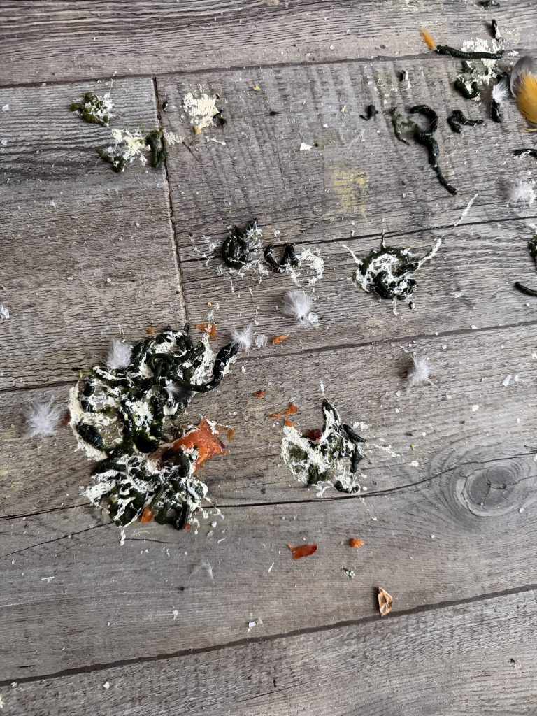 Sur la photo il y a un reste de truite cuite de la veille au soir, et quelques plumes vieilles et tombées lors de la toilette du matin (la mue printanière commence doucement ici).